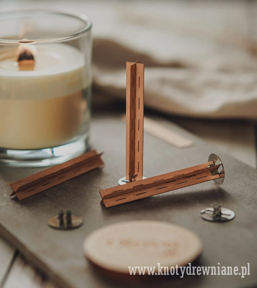 Posiadamy w swojej ofercie dowolne rozmiary knotów z naturalnego drewna (buk) w grubości 0.6 i 1 mm oraz knoty pilśniowe w grubości 7 lub 10 mm.